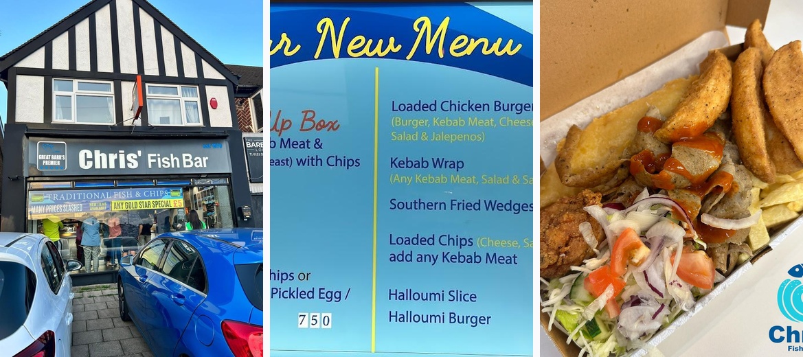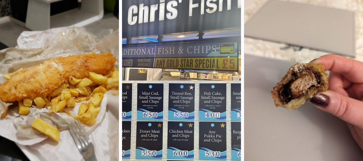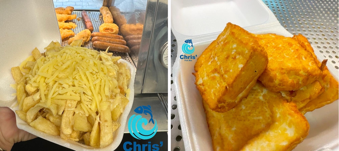 Chris' Fish Bar offers a wide range of delicious options, including classic fish and chips, kebab wraps, loaded chicken burgers, and even a few special treats like deep-fried Mars bars and mince pies. For a perfect quick bite, you can also try their mini cod and chips or doner meat and chips.